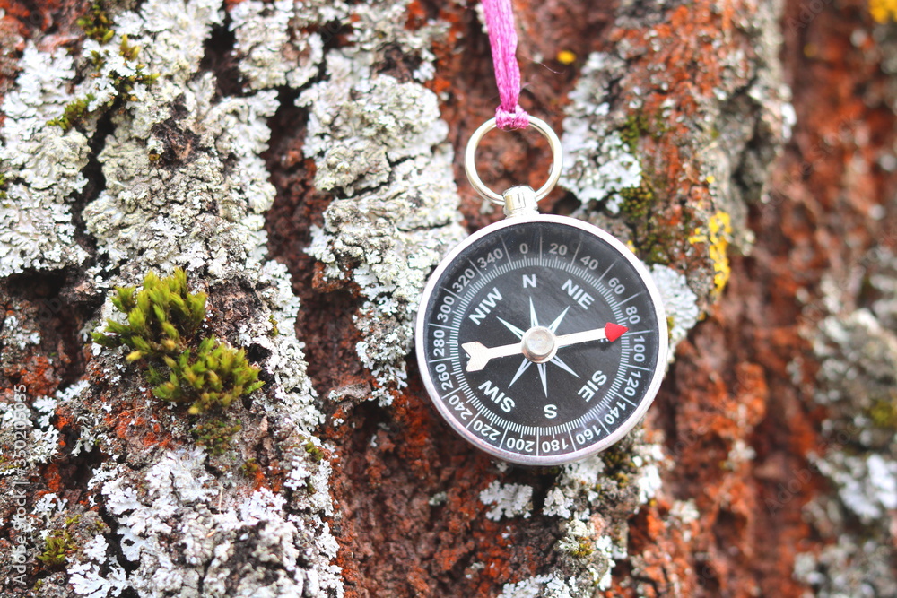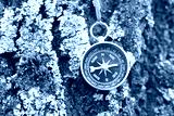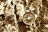 Old compass on natural wooden background