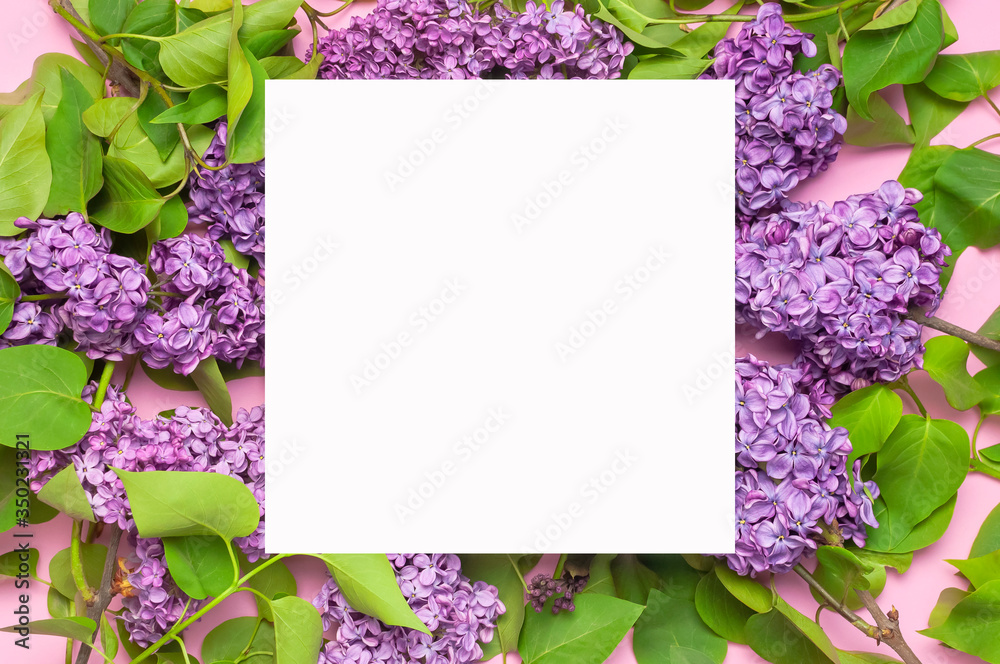 Creative layout for design with lilacs. Beautiful blooming branches of lilac flowers and white blank paper on pink background. Greeting card with flowers for the holiday March 8 Mother's Day Flat lay
