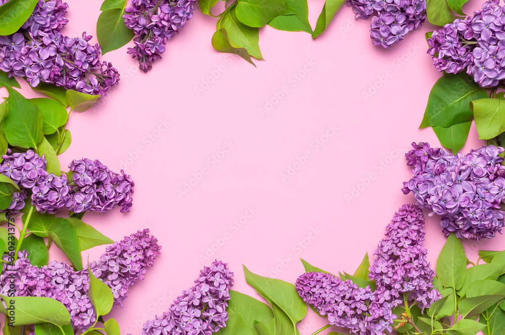Frame from Beautiful blooming branches of lilac flowers on pink background. Greeting card with flowers for the holiday March 8 Mother's Day Spring nature floral background Flat lay top view copy space