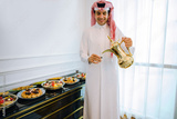 Arab man in traditional white clothes pour tea on Iftar and eat Arab sweets