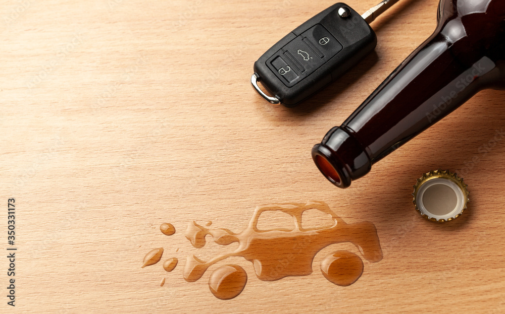 Drunk driving. Accident with a broken car from alcohol. Beer bottle and car keys. Broken car