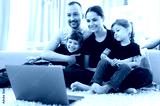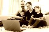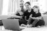Video call. Happy cheerful family. Young parents and their two amazing daughters communicate via video conference with grandparents sitting at home on the floor in stylish casual wear