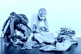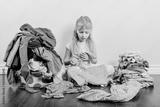 Mommy little helper. Cute Caucasian girl sorting clothes. Adorable funny child arranging organazing clothings. Kid with messy stack of clothes things on floor. Home chores housework for children.