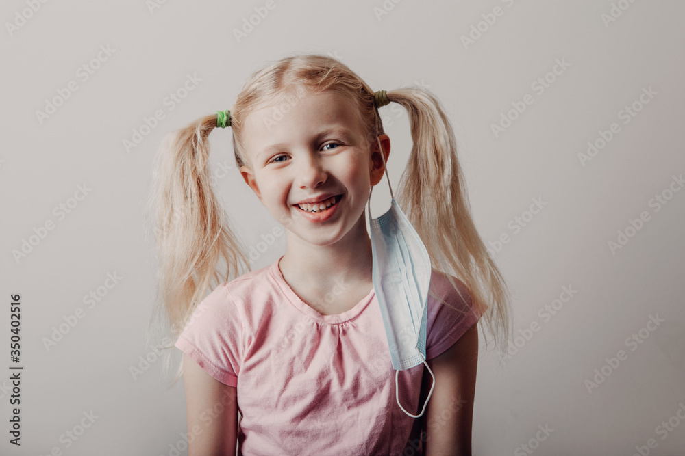 Portrait of Caucasian blonde girl taking off sanitary face mask. Preschool child with protective mask on ear. End finish of covid-19 quarantine and self isolation concept.