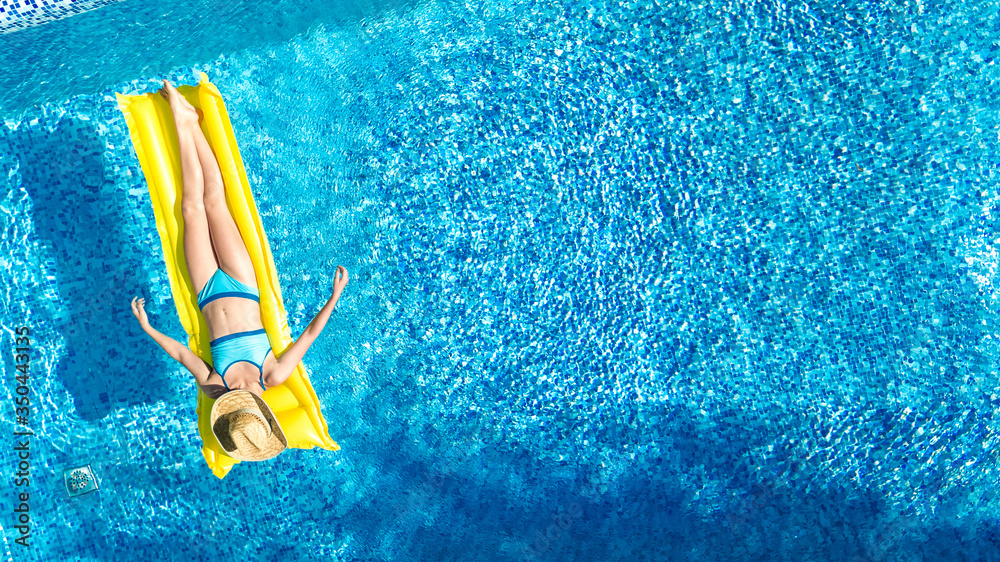 Girl relaxing in swimming pool, child swims on inflatable mattress and has fun in water on family vacation, tropical holiday resort, aerial drone view from above