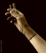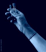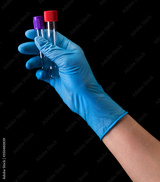 Doctor's hand in medical gloves holding test tube with coronavirus COVID-19
