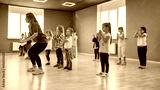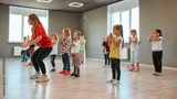 Group of little boys and girls dancing while having choreography class in the dance studio. Female dance teacher and children