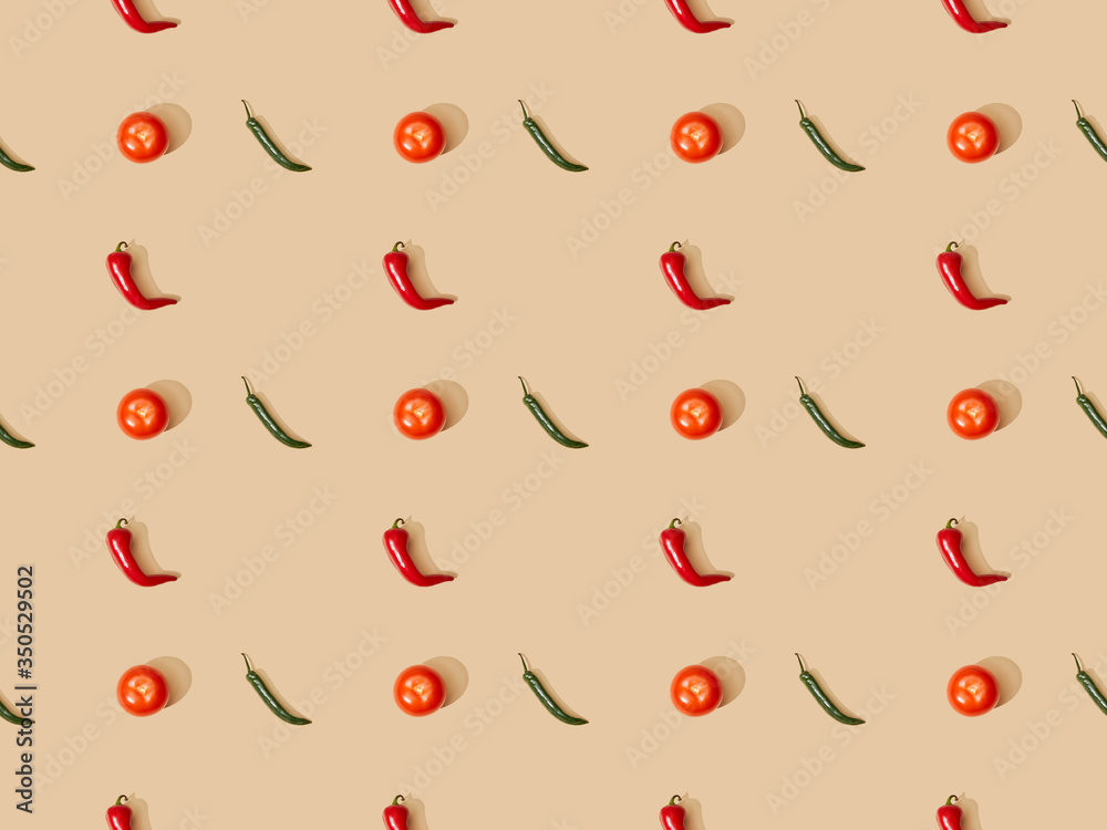 top view of red spicy chili peppers and jalapenos with tomatoes on beige background, seamless pattern
