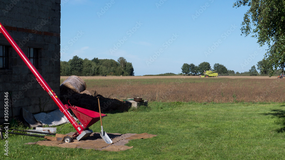 Old grain harvesting combine and waiting grain conveyor by obsolete granary.
