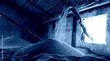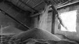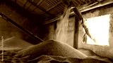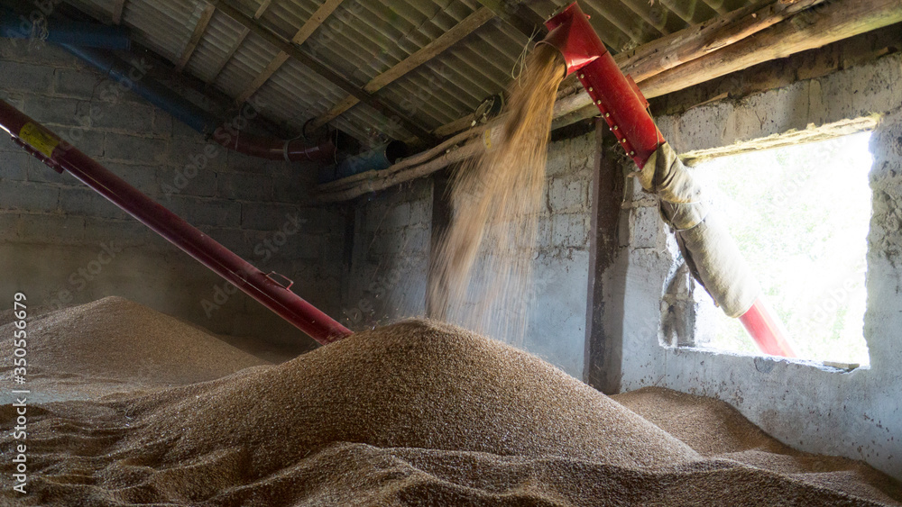 Cereal, wheat, rye - pouring into an antiquated granary on the farm. Grain conveyor.