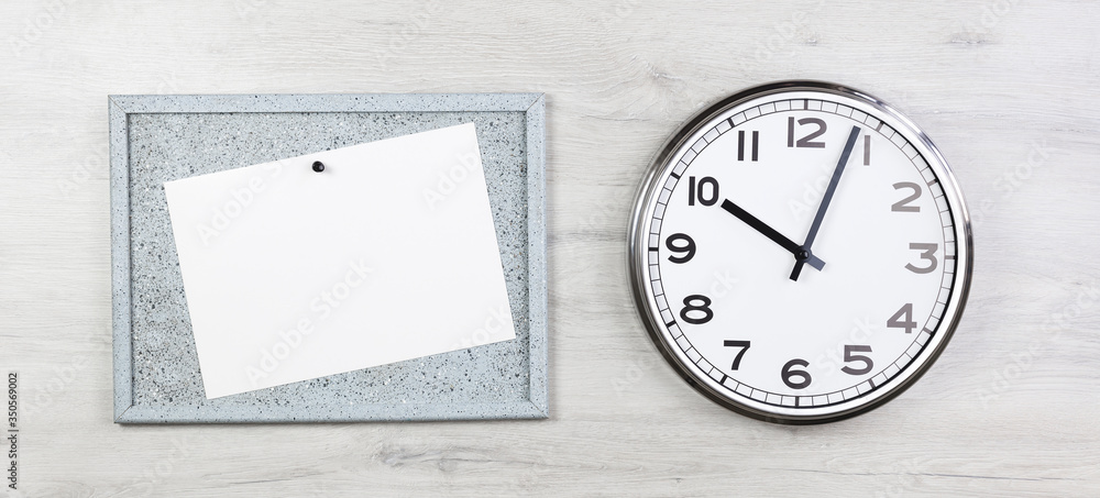 Plain wall clock with notice board and pinned sheet of paper on grey wooden background. Ten o'clock. Close up banner with copy space, time management or school concept and lunch time