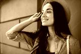 Joyful hipster girl in stylish hat emotionally laughing at urban setting of city streets, happy carefree woman with perfect candid smile on face feeling great during leisure for recreation outdoors