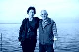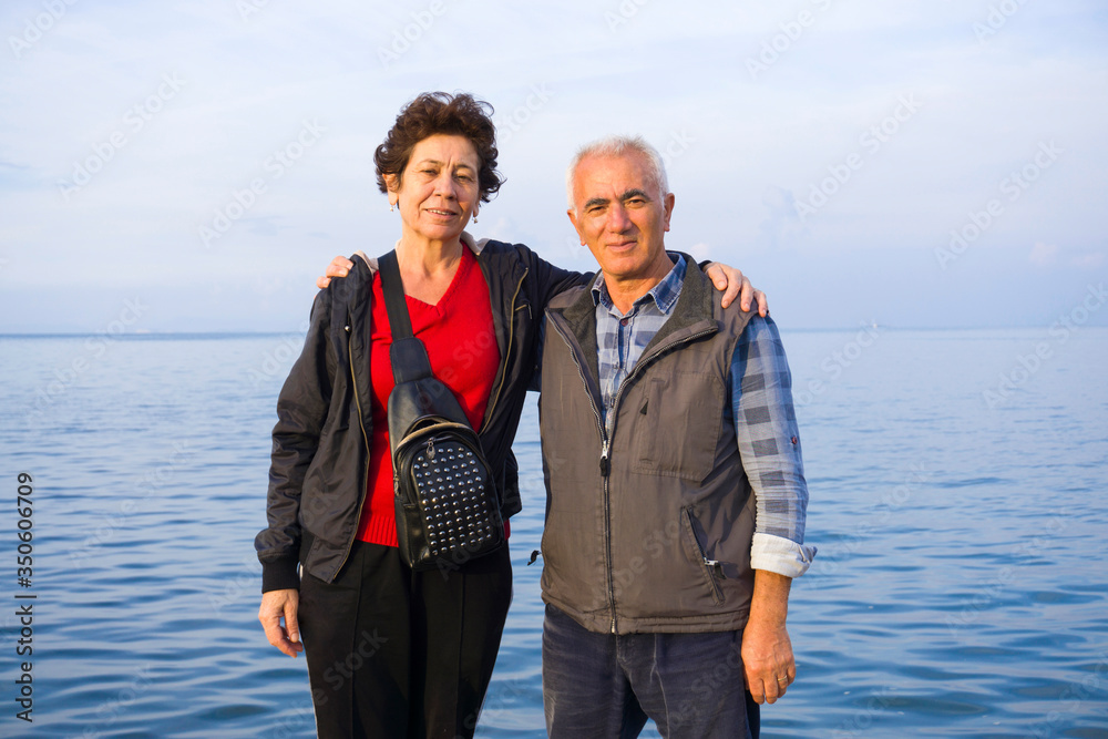 Old couple putting their arms around shoulders and lookin at camera on shore. Romantic senior man & woman enjoying now, today. Seize the day moment. Wallpaper picture of two 60s person together