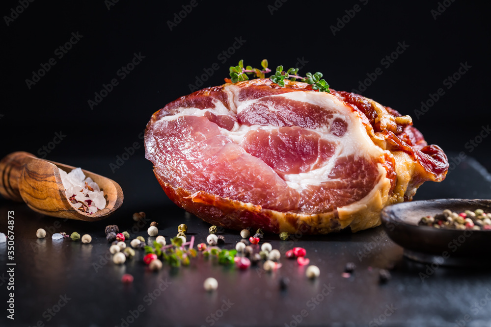 Piece of smoked ham with pepper and herbs on black background