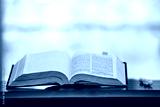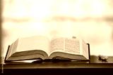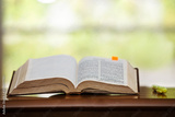 A spanish translation of the holy bible that is well aged, worn and tattered due to frequent use, opened to the book of Daniel and next to a highlighting marker on a wooden table.