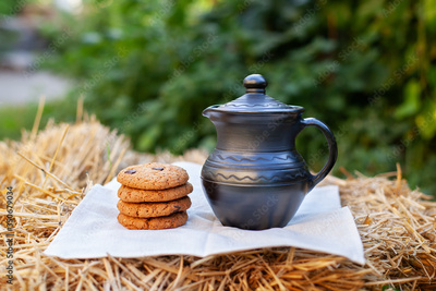 Clay jug, homemade cookies on straw in garden. Oatmeal cookies with Milk jug on straw in field. Milk in clay jug. Organic product. Concept natural products, healthy food. Still Life in Rustic style