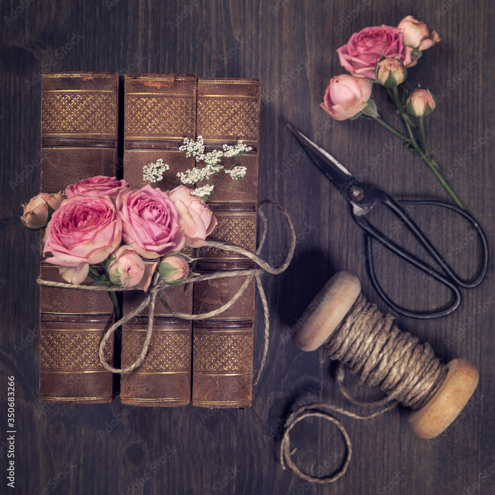 Pink flowers and the old books
