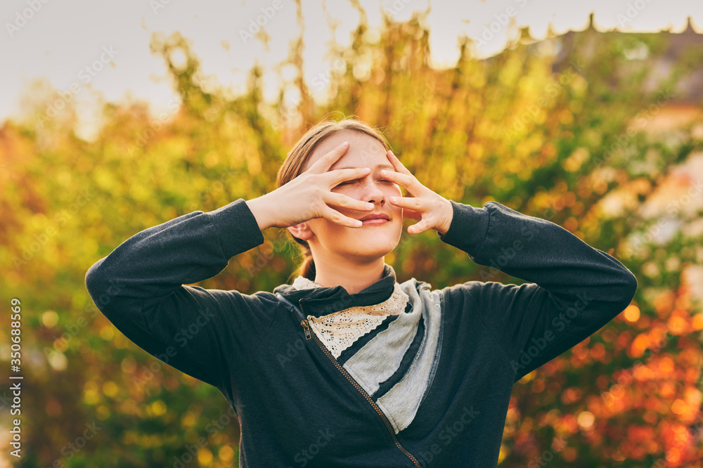 Outdoor portrait of young teen girl in golden light, hiding face with hands