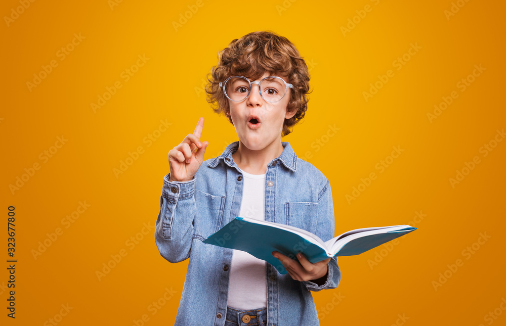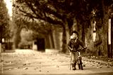 Cute little boy walking in autumn park, pulling his bike, holding a stick