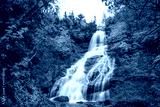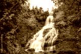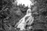 Gushing water fall in an autumn forest landscape with dense trees, Cape Breton. Beulach Ban Falls, Autumn waterfall view.