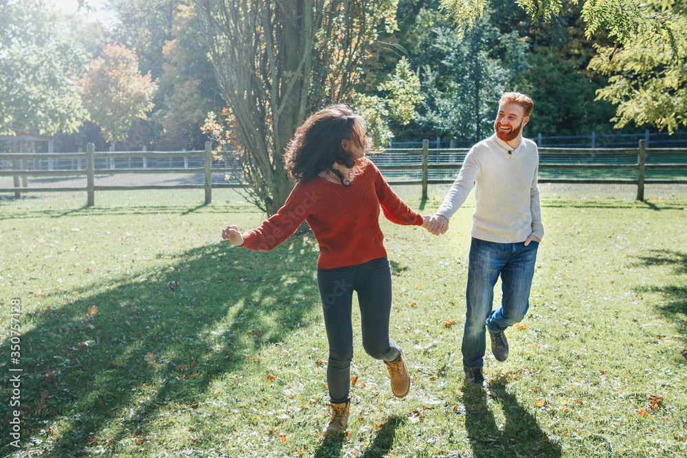 Happy couple man and woman in love walking in park outdoor. Lovely beautiful Caucasian heterosexual people dating walking on an autumn fall summer day. Adult people holding hands.
