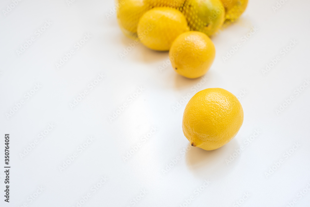 Close up of lemon on white background with net bag behind (selective focus)
