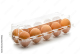 chicken eggs in box package on white background.
