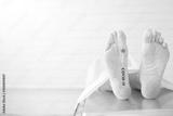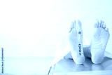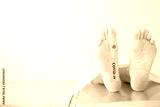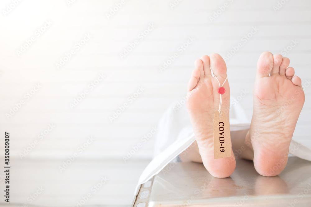 Legs of a corpse in a morgue on a table with a tag with the inscription COVID-19. Pandemic of the new coronavirus. Tragedy and death