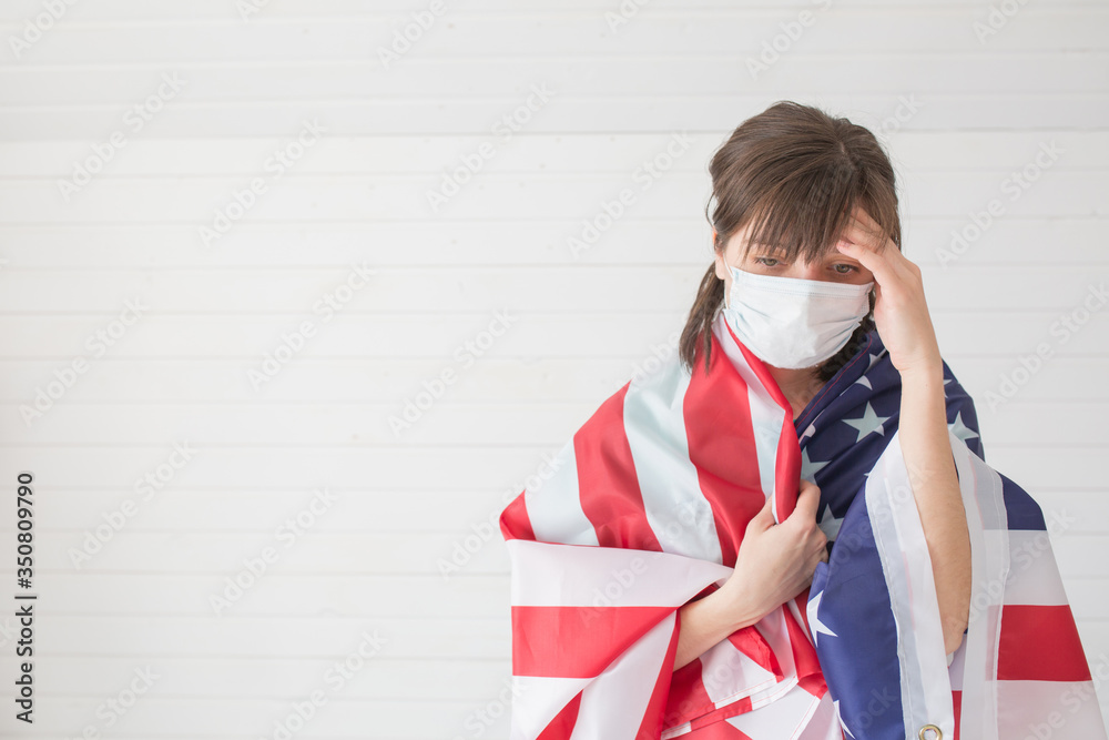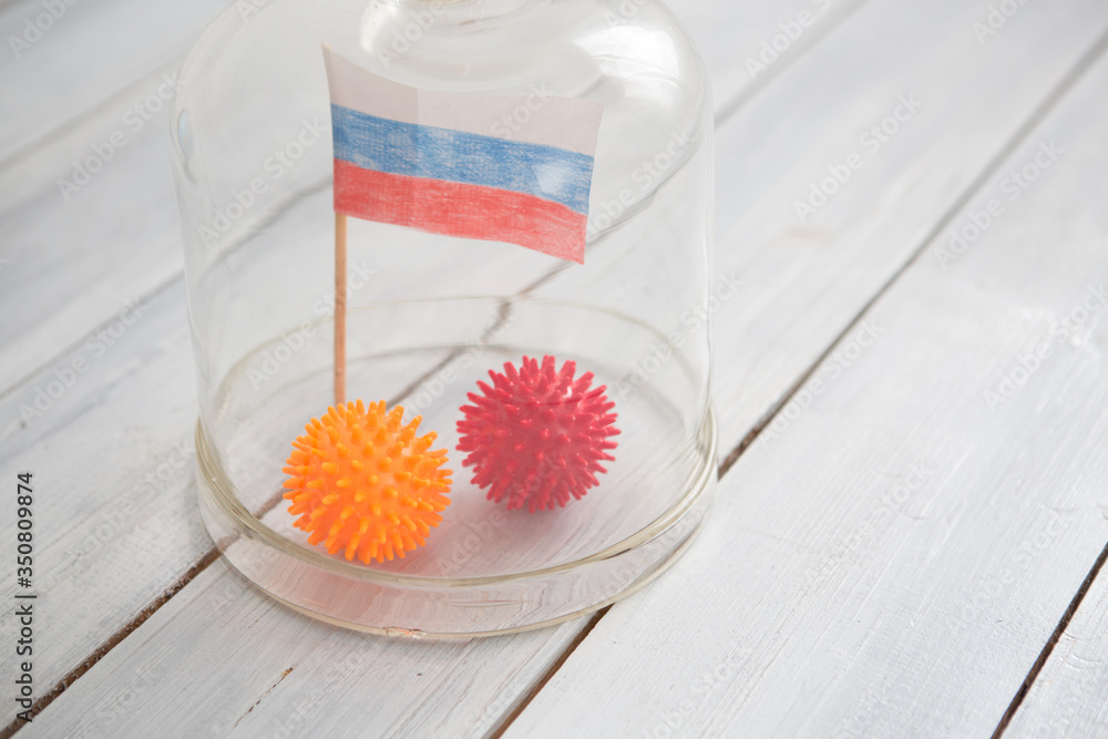 Ball in the form of a model of coronavirus Covid-19 and the Russian flag under a glass cover. America's Emergency Regime Due to COVID-19 Pandemic