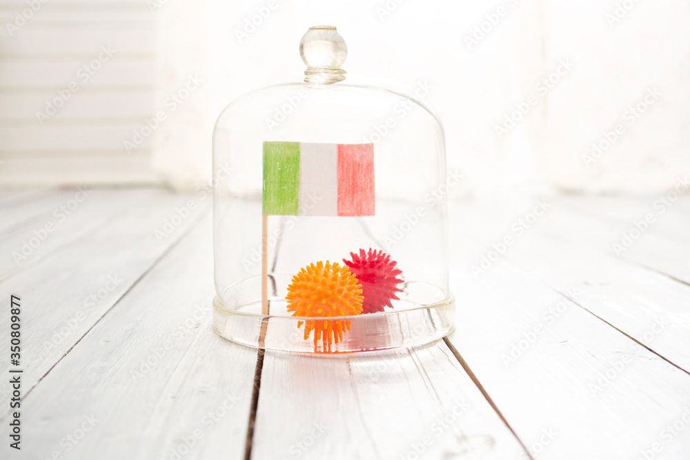 Ball in the form of a model of coronavirus Covid-19 and the Italian flag under a glass cover. America's Emergency Regime Due to COVID-19 Pandemic