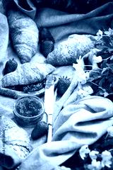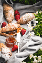 Сroissants, strawberries and jam. Summer picnic on a sunny day. Breakfast on green grass in the garden with white spring flowers blossom. Eating food outdoor. Сroissants, strawberries and jam
