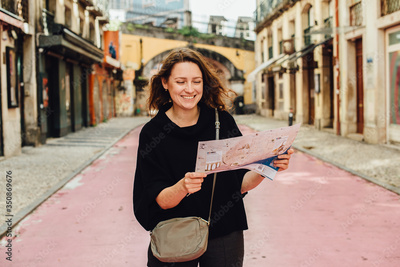 Young caucasian woman with a map standing alone on the Pink Street, famous night life place in Lisbon, Portugal. European travel destination concept, lost tourist concept