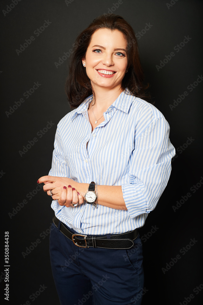 Studio business portrait of beautiful mature woman wearing blue stripe shirt