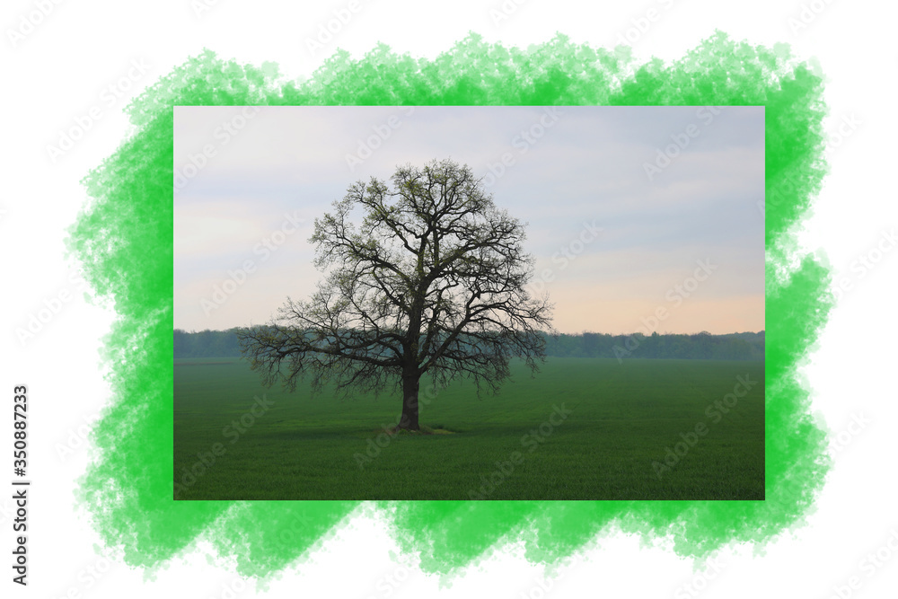 Beautiful lonely tree in spring without leaves against sky and and green spring grass / 3 tree of 4 trees from the collection "The seasons. Four seasons."