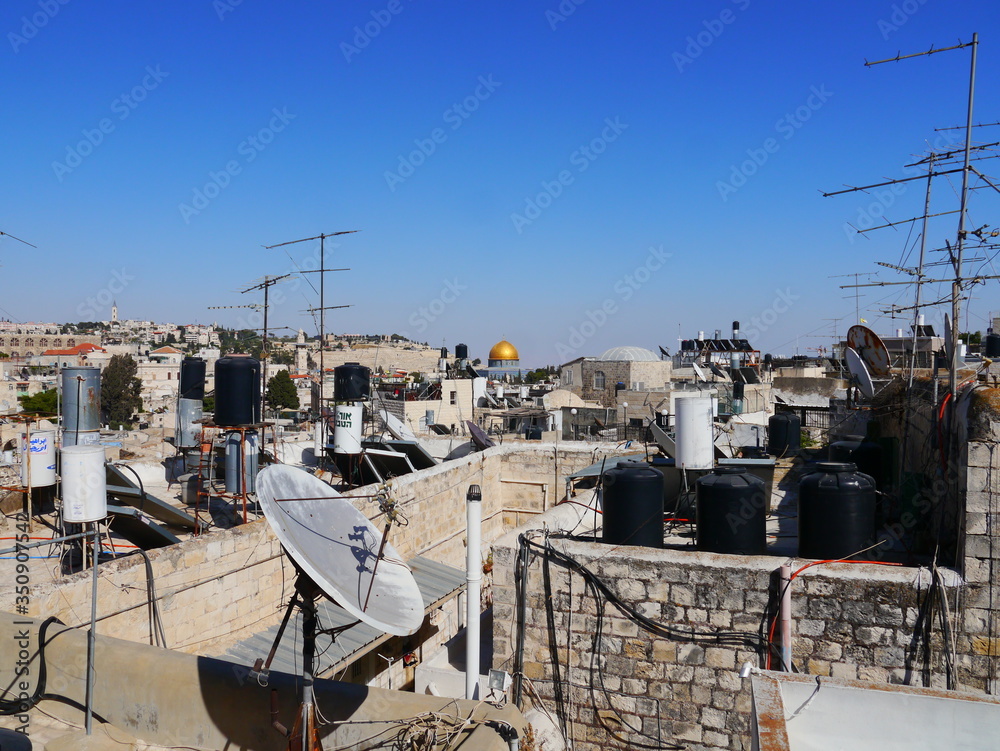 panoramic view over the roof tops in the old town of Jerusalem on a sunny day to Al-Aqsa Mosque, Israel, Near East