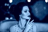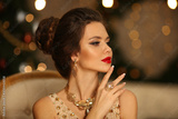 Beauty portrait of elegant woman with wedding hairstyle and makeup. Beautiful brunette girl with golden jewelry in prom dress sitting on modern chair over bokeh lights xmas decorations.