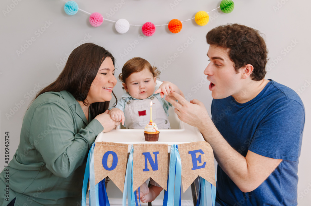 Caucasian family with baby boy celebrating his first birthday at home. Mother father dad with child kid toddler blowing candle on a cupcake. Happy birthday and cake smash concept.