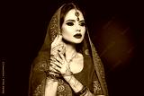 Portrait of beautiful indian girl in red bridal sari. Young hindu woman model with kundan jewelry set. Traditional Indian costume lehenga choli. Henna painting, mehendi on bride's hands.