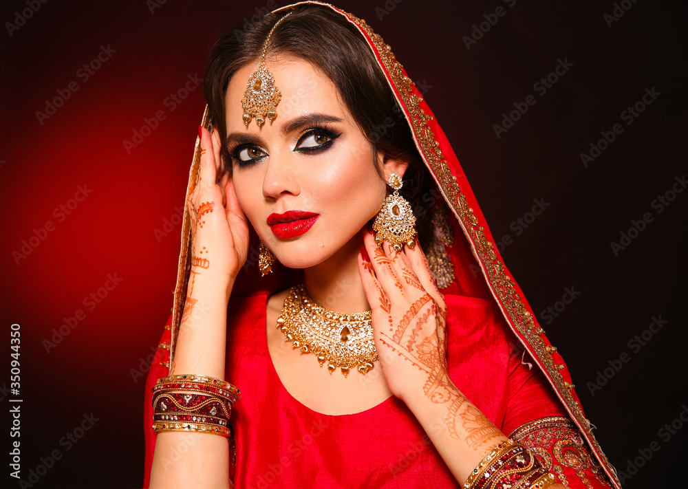 Portrait of beautiful indian girl in red bridal sari. Young hindu woman model with kundan jewelry set. Traditional Indian costume lehenga choli. Henna painting, mehendi on bride's hands.