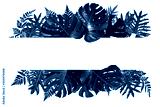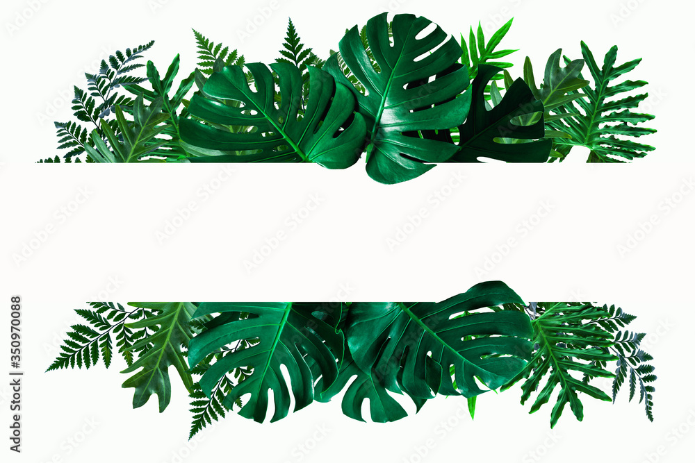 Green leaves nature frame layout of tropical plant bush (monstera, palm, philodendrons, ferns) on white background, flat lay