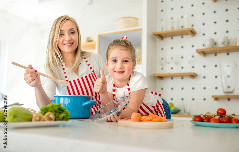 Mother and daughter having fun while cooking together in kitchen at home