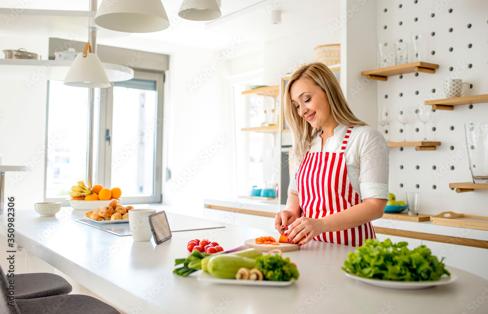 Young smiling woman preparing healthy meal with vegetables in bright modern kitchen