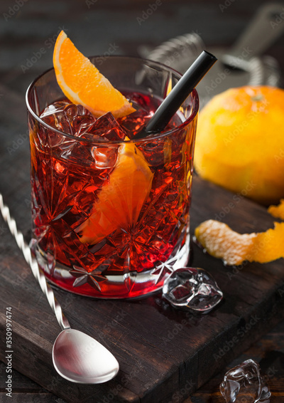 Negroni cocktail in crystal glass with orange slice on chopping board with spoon on dark wooden background. Macro