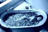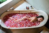 Top view of Woman relaxing in stone bath tub with tropical flowers petals in red ans violet colors, organic skin care, luxury spa hotel, lifestyle photo
