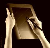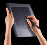 Hand holding digital graphic pen and drawing graphic tablet isolated on black