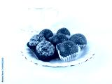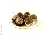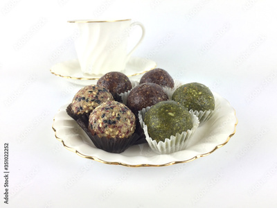 Energy balls which are booster food are set on a white plate in front of a white tea cup and isolated on white background.
