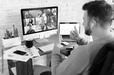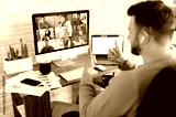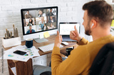 Video conference. Business partners communicate via video using laptop. The guy talks with his business partners appearance about plans and strategy. Distant work