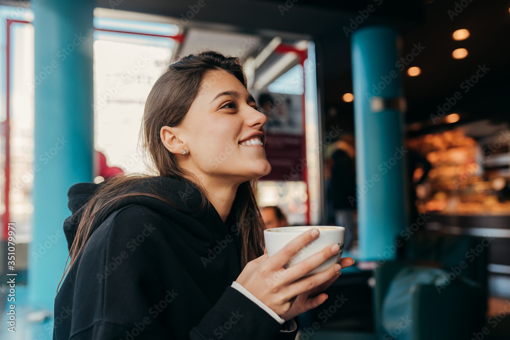Close up portrait of pretty female drinking coffee.