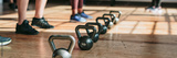 People standing by kettlebells in the gym