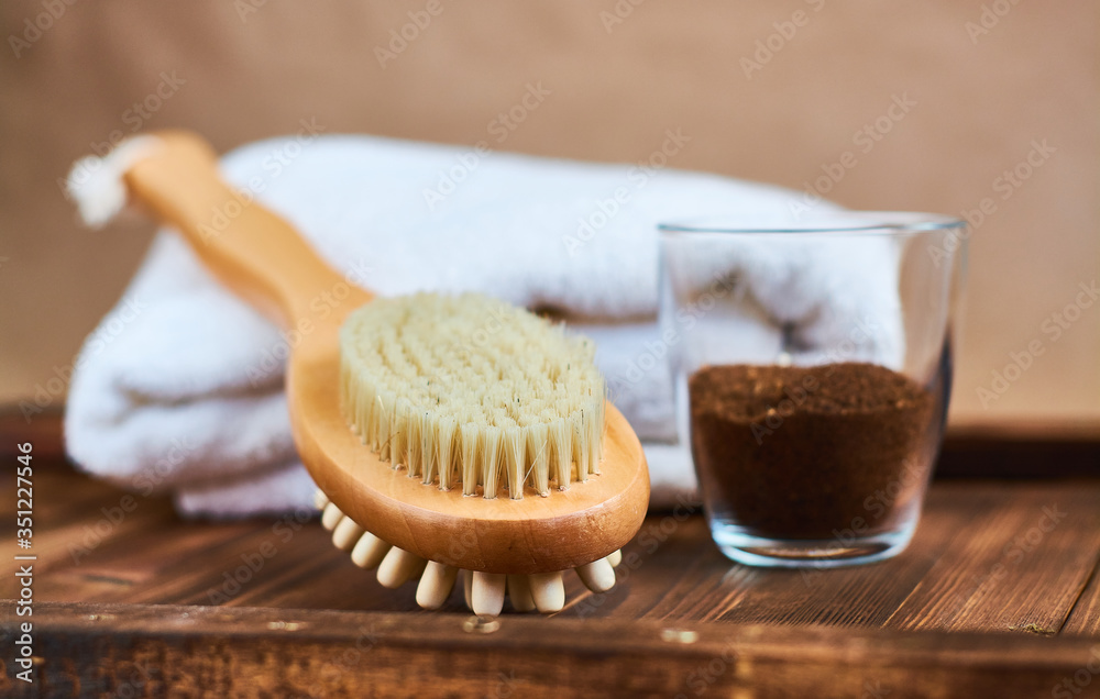 Brush massage counter, washcloth for shower with double nozzles with bunch of dried straw and natural coffee scrub in glass, towel on wooden dark background. Care for body, beauty and health.